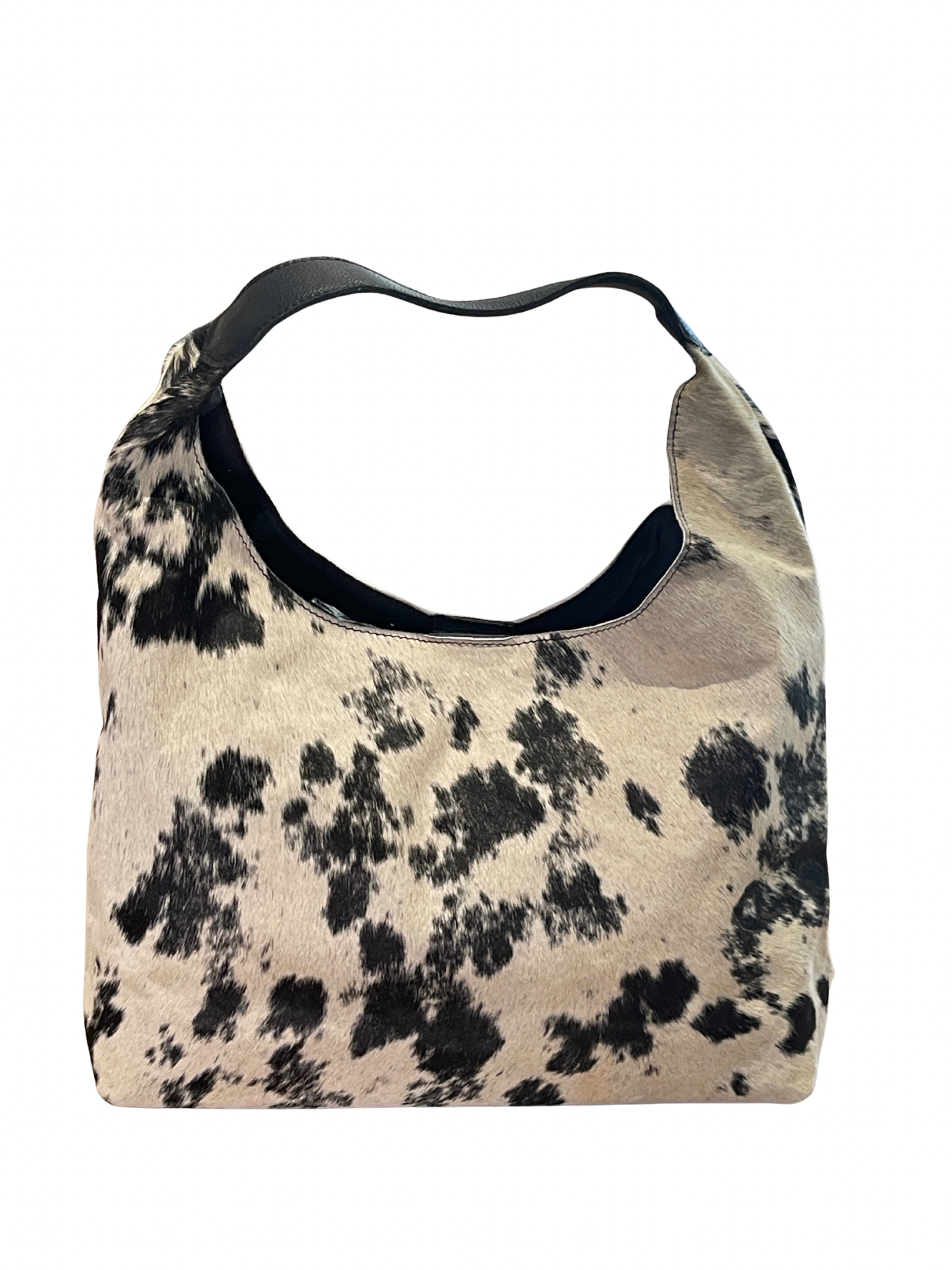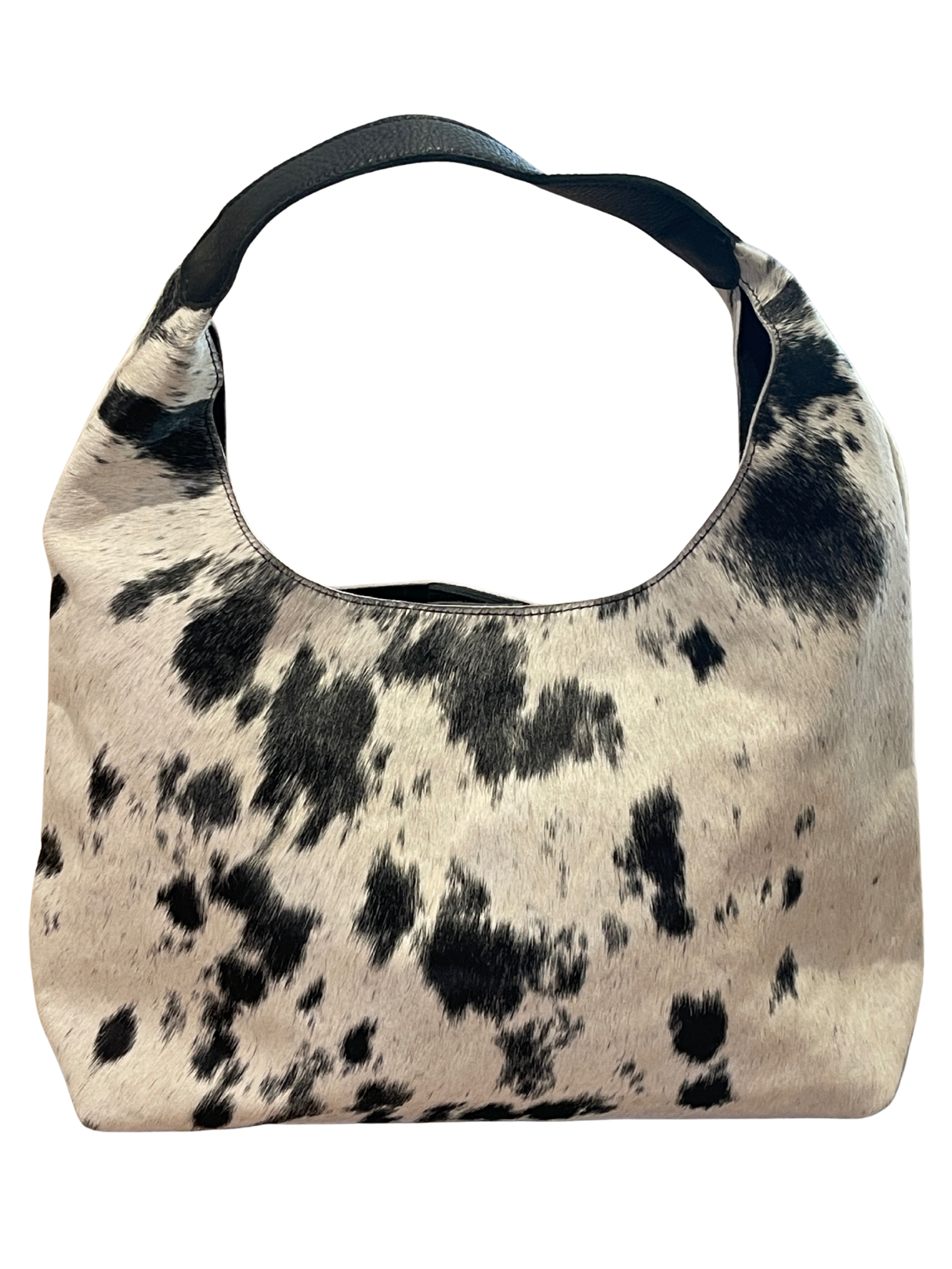 The fabulous, unique Boho Slouch Bag is part of the Forever Wild branded cowhide collection. This design has hair on hide on both sides. Each bag has a unique cowhide print and exudes natural beauty.
